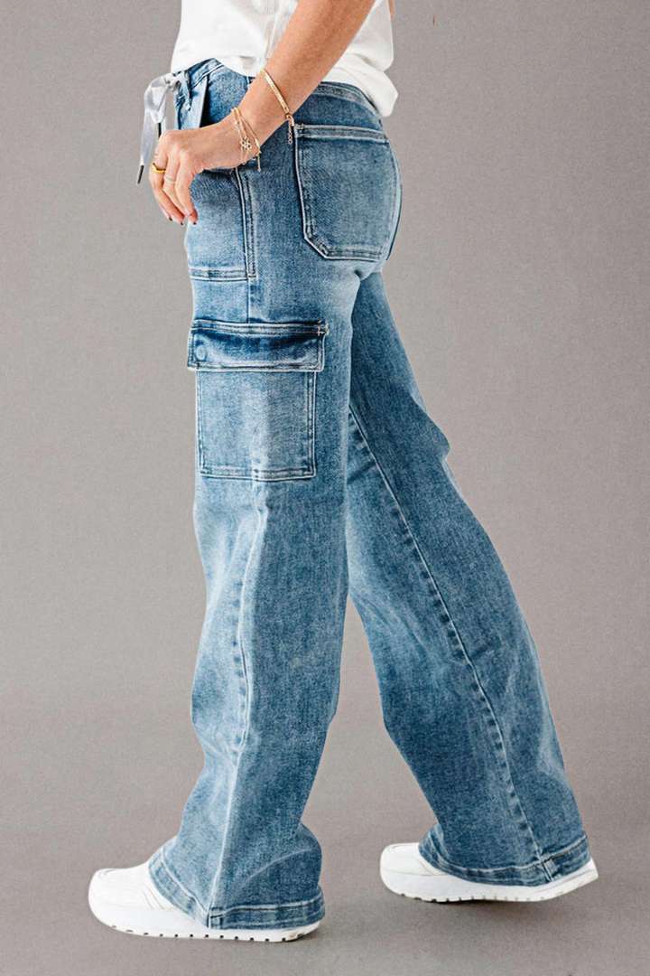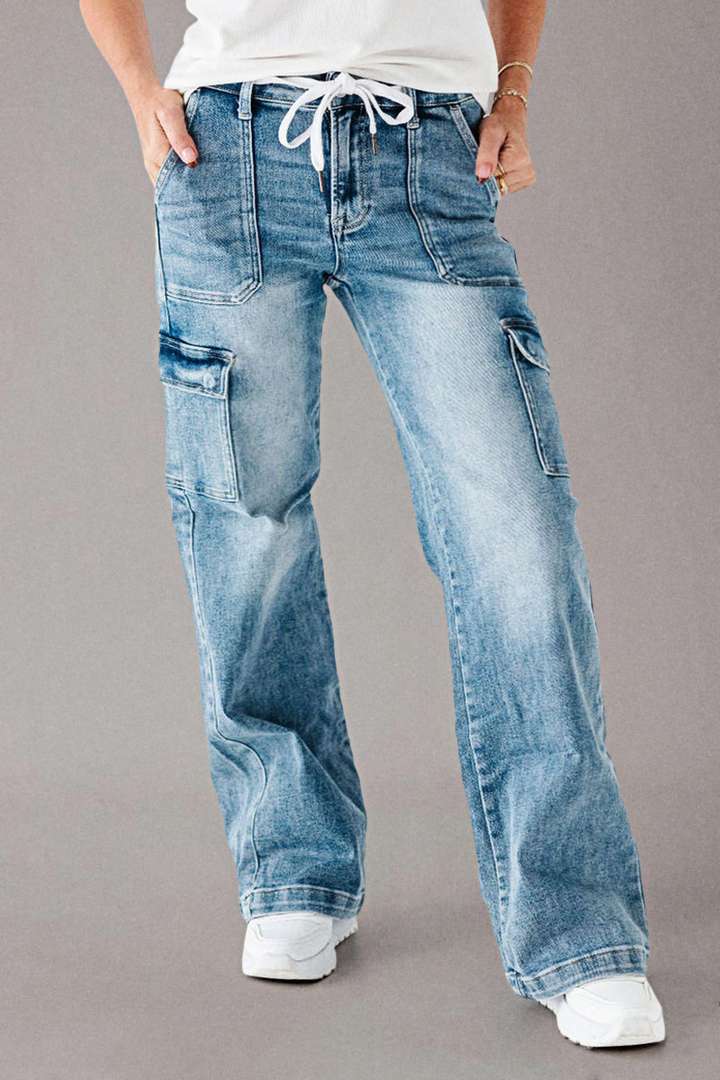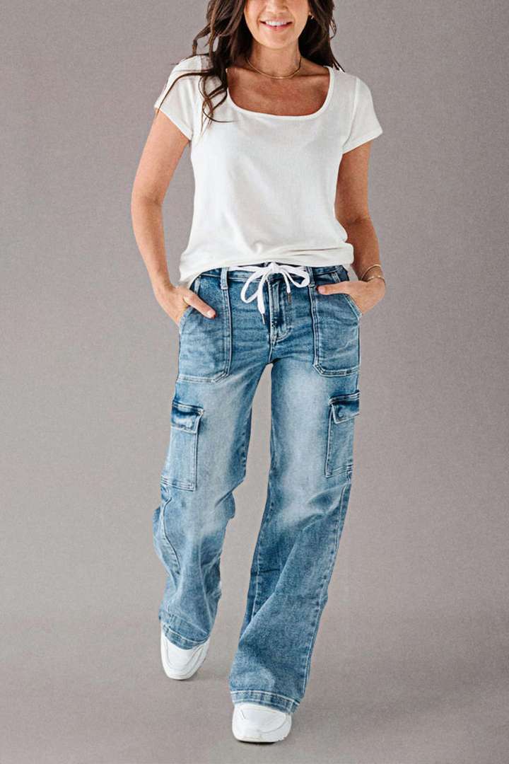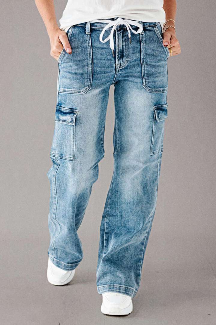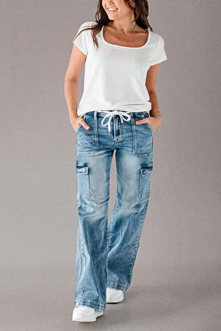 Straight leg jeans women's casual lace up multi pocket functional work pants